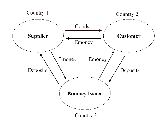 When considering the effects of offshore e-money issuing it has to be taken into account that the issuer has to be paid somehow for the e-money he is issuing and that the recipient of e-money may wish to convert it into conventional money (cash or deposits). Figure 1 illustrates the case of an offshore issuer based in country 3 who issues e-money that is used in country 1 and 2. In such a case, a customer from country 2 who wants to use this e-money has to pay for it. Supposedly, this will be in 'normal' money. So, either the issuer has an account in country 2 or the customer has to make an international transfer from country 2 to country 3. Furthermore, if the payment receiver (say an Internet store in country 1) wants to convert the e-money balances he receives into national currency, the issuer has to transfer country 1 money to his account. Again, this presupposes an international transfer or an account with a local bank.