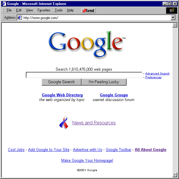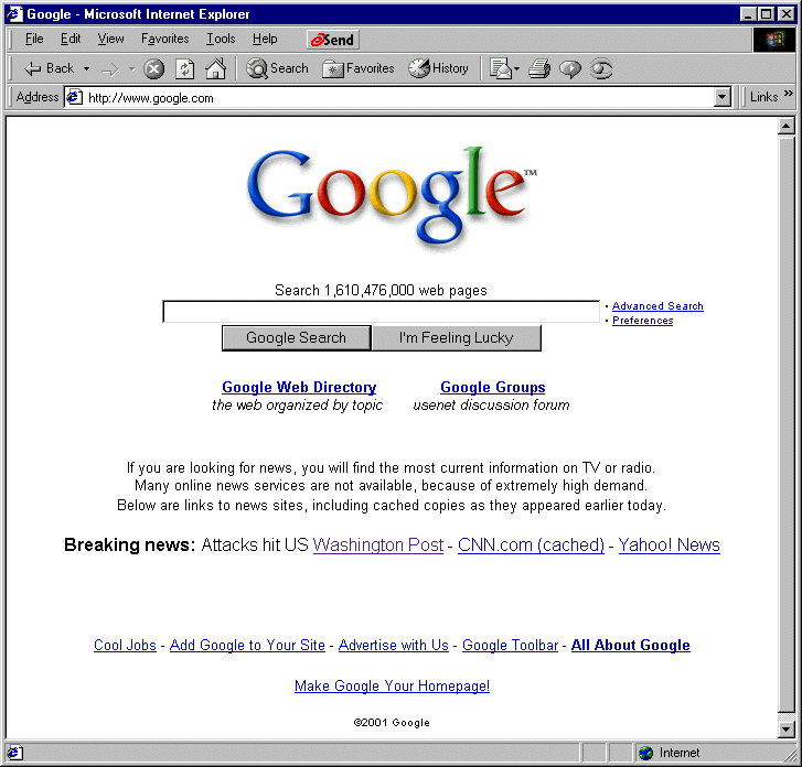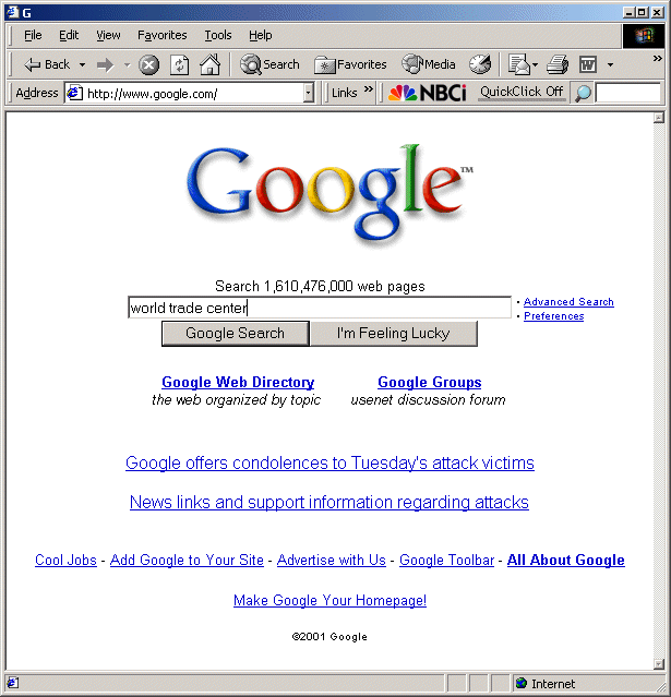 One search engine, relative newcomer Google, has resisted the temptation to become an all-encompassing, one-stop-shopping, complex portal. Before the September 11 attacks, Google only offered the sparest of home pages -- a simple logo, a single search box, and a handful of links to Google's own services. Not even a single banner ad appears on the Google home page. Google resisted the temptation to become yet another search engine-turned-portal. The only event-related content one ever noticed on Google was its amusing and tastefully crafted subtle changes to its logo, in order to honor holidays. (See http://www.google.com/holidaylogos.html.) Prior to September 11, Google devoted itself to a vision of "search is king." The user is tempted to do one thing: type a search phrase into the single form on screen, and hit Search. And the evidence is that millions of users did just that, beginning just moments after the attacks.
