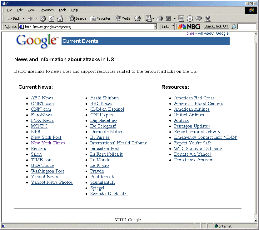 For instance, note that on September 14, Google offered links to New York hospitals as well as links -- and telephone numbers -- for businesses that had had operations in the World Trade Center. By October 2 such links had been removed, replaced by links to other sites that could provide victim information. The October 2 list improved upon the list of respected international news sources.