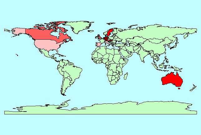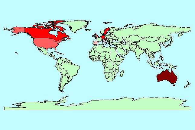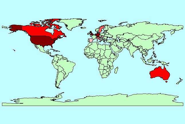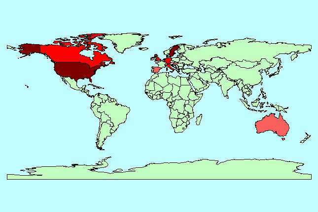 Several immediate observations are striking. The first is the apparent dominance of the United States over free software development. The country contributes more than twice the number of developers to Linux as its closest runner-up, and nearly three-times as many to the Gnome project as any other country. A brief glance at the data confirms that large contributors in absolute terms also tend to be developed industrial countries with legacies of international openness and highly-educated, English-speaking populations. Northern Europe is particularly well represented. Not a single developer in either project comes from the Middle East, while all of Africa contributes but two in total - one from Egypt and one from South Africa. Asian and South American countries - presumably because of language barriers - are also underrepresented. Open Source development does appear - on first glance - to be highly correlated with "post-industrial" states and high levels of material development, an observation that supports the post-scarcity hypothesis.