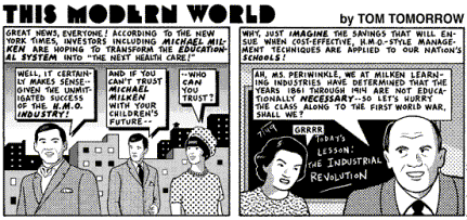 News of some of these developments has not been well received by many academics. A cartoon by Tom Tomorrow sums up many educators' fears about Milken and Allen's dream of "EMOs", and of a corporatized higher education [ 9].
