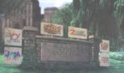 The image shows a campus with lush green lawns, classical architecture and a brick frontispiece displaying a sign that reads "State College" [ 14]. The sign is surrounded by crude advertisements.