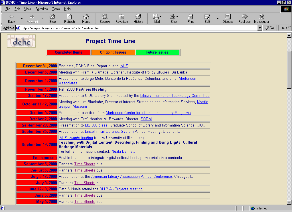 When the DCHC proposal was first initiated, a time line of activities was also set up. This time line was to be used to direct project activities and goals and ensure that they were all met in a timely manner. The time line was included on the project Web site (see Figure 1) and could be monitored by all participants as the grant progressed. The time line was updated on a regular basis to keep everybody informed of the status of the project. The time line on the DCHC Web site was color-coded for quickly recognizable indicators of the status of activities - "completed," "ongoing," or "future."
