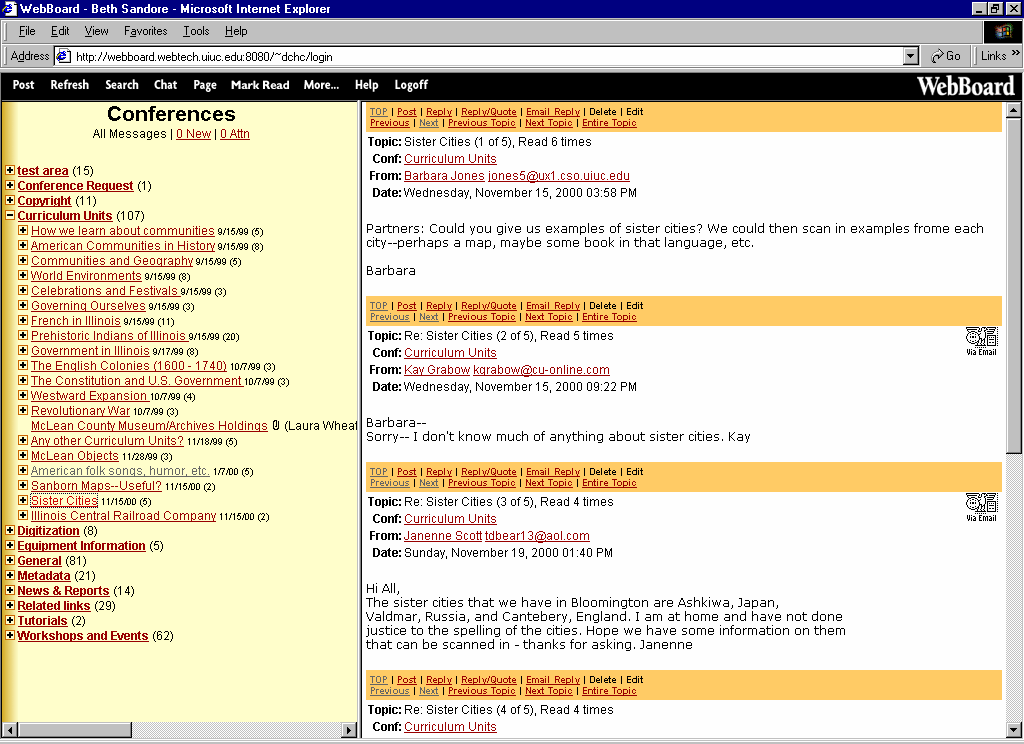 Using WebboardTM ( http://webboard.oreilly.com) allowed us to follow specific lines of discussion much more closely and enabled us to much better understand our shared goals for the project. WebboardTM facilitated many more levels of communication among participants than could a Listserv, phone conversations, or post. Formal and informal messages could be kept apart to allow for better understanding of project-related discussions. Similarly, those who were not interested in a particular discussion knew that they need not follow it as closely as they might another, and the WebboardTM allowed them to distinguish easily among the various discussions. It also ensured that decisions about the project need not necessarily be made by consensus among every single project participant, but by those who were following a particular discussion more closely. Figure 2 is a screenshot of the WebboardTM, where the discussion topics are visible on the left frame, and the details of one discussion are visible in the right frame. Finally, WebboardTM also allowed us to admit a number of outside advisors to particular discussions while also restricting their access to other topics. This enabled us to get feedback and advice at critical junctures from observers that provided additional insights into the direction of the project. Figure 2 shows an example of an e-mail exchange between elementary school teachers and a library special collections curator regarding the digitization of information related to sister cities.