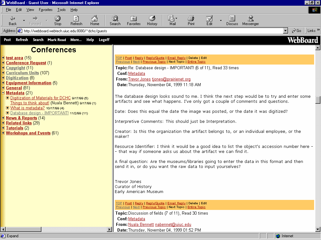 WebboardTM helped to facilitate a number of additional critical discussions throughout the project, including the manner in which the group agreed to qualify the Dublin Core metadata scheme that was used, the details of the group's collaborative agreement to make digital materials accessible through a shared database, the conditions of use for these materials, practical advice about installing and configuring equipment and software, news items, reports from conferences, meetings, and reports to our funding agency, and links to related useful information. Figure 3 below shows some of the exchange surrounding the Dublin Core metadata scheme.