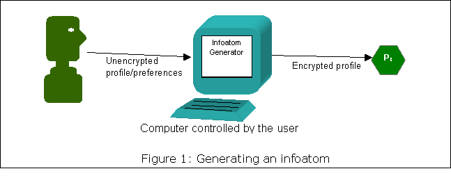 Figure 1 illustrates the creation of an information atom. Participants in this market, through the use of a program on their own computer, can encrypt their profiles and generate infoatoms. These infoatoms can then be distributed to data miners who might want to use the data for various purposes.