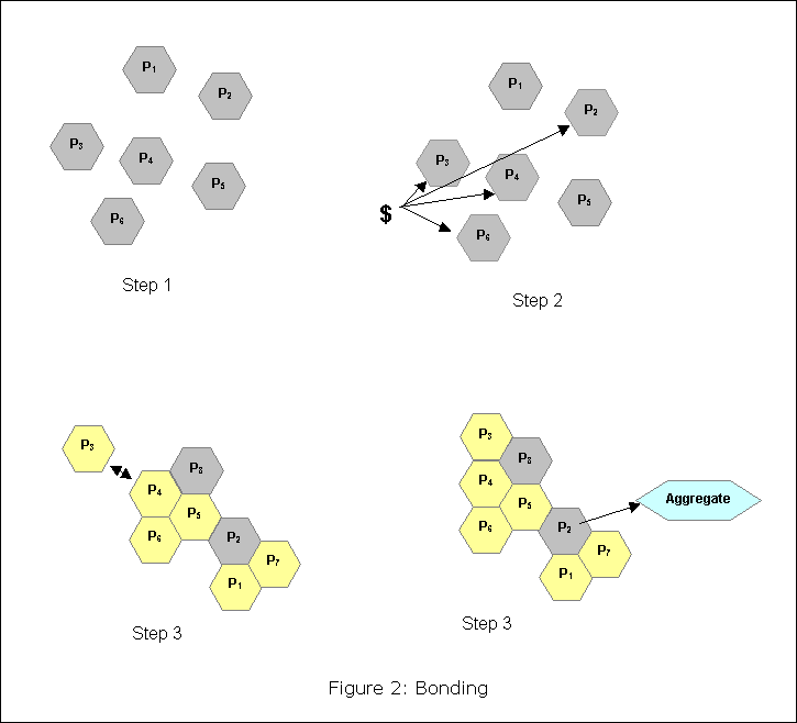 The generation of information crystals through this bonding process is illustrated in Figure 2. Individual infoatoms (as shown in step 1) are activated by the data miner via some financial transaction. Once activated, an infoatom will randomly interact with other infoatoms and form connections (step 3). An infoatom will determine the number of other atoms with similar characteristics. If there are enough similar atoms the infoatom will become active (as seen in yellow). Once all infoatoms have bound to the crystal, the profile data is emitted and collected by the crystal and the aggregate statistics are passed on to the data miner (The information crystal architecture provides the mechanism for anonymously generating this report, but the protocolspecifics are beyond the scope of this paper).