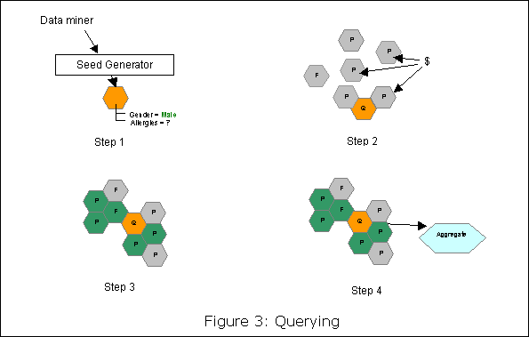 Figure 3 represents one such interaction between the data miner and an information crystal. In this scenario the data miner wishes to knowparticular allergies present in males with given characteristics and constructs a seed reflecting this query. The seed interacts with information atoms, which then cluster around the seed forming a crystal (step 2). Those atoms that match the query and that are surrounded by a sufficient number of similar infoatoms become activated in step 3 and eject an aggregate report in step 4.