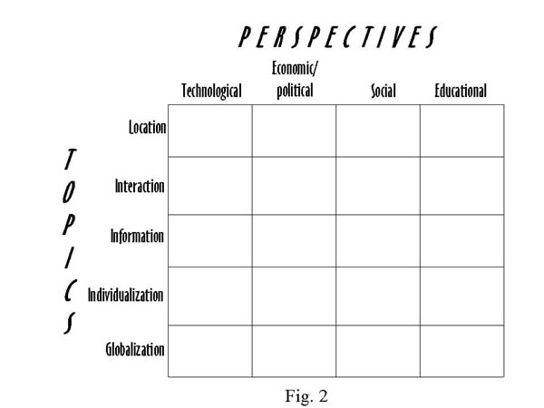 A quick glance at this grid hints at the complexity of the literature. Any one of the topics can be addressed according to one or more perspectives. A sense of fragmentation derives from the fact that the literature itself is not written using such tidy labels and cells, and not all cells receive the same amount of attention among authors. In addition, as with topics, as time goes by perspectives wax and wane in importance. For instance, an "earlier" work such as Negroponte's (1995) is more likely to be written from a technological perspective because the natural excitement and hope surrounding new technologies tends to overwhelm consideration of long-term social consequences.