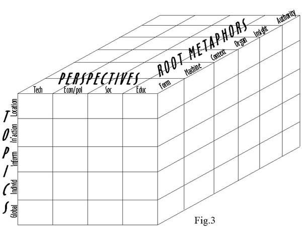 To this point we have used a mapping metaphor as an aid to put forward our ideas. The metaphor has been a standard, literary sort, and it has been used to illuminate features of the argument and to provide a somewhat more relaxed and readable text. But, the metaphor is not essential for delivering the message. The points could have been made clearly, if dryly, without the mapping metaphor. However, now is an opportune point to introduce a very different concept of metaphor, one in which the tie to meaning is far more intimate. We want to shift the discussion from literary metaphor to philosophical or root metaphor. The third dimension is seen in Figure 3.