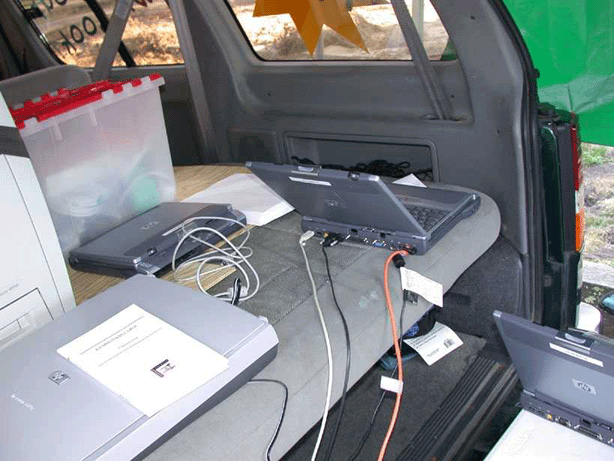 (photo by Michael Ward of Hidden Knowledge).I asked about the connectivity. Kahle said the Hughes Direcway system runs at about 64 kpbs upstream and up to one megabit downstream. Motosat is a company that modifies this consumer product so that it works with a mobile connection. Park the van in a level area and make sure that the southern sky is visible because the antenna must see the satellite. The Motosat system uses GPS to aim the dish and establish a good connection Another company, Tachyon, Inc. is selling a mobile network connection. The Burning Man event has been using one since 1999. This sort of connection is of great interest in other countries and in parts of the U.S. where land lines have not reached. The bookmobile VSAT connection is connected to an 802.11b (Wi-Fi) network which surrounds the van, so anyone in the neighborhood could bring a laptop and connect to the server and choose her own books or copy some that had already been requested.