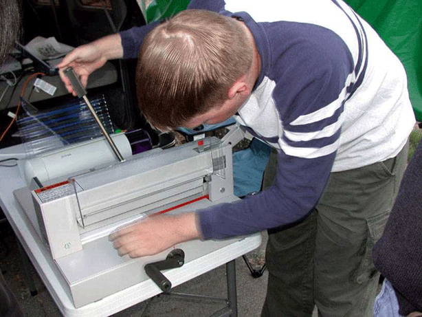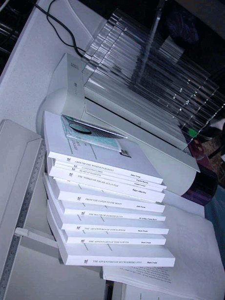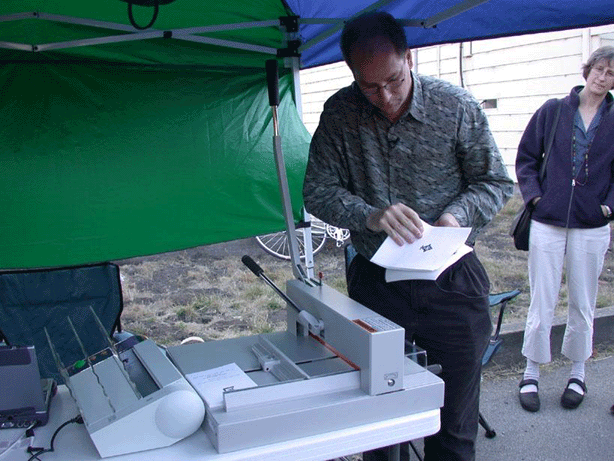 (photo by Michael Ward of Hidden Knowledge).A newspaper reporter questioned the practicality of the Internet bookmobile. Wouldn't it be better to print materially more cheaply at a central location and then distribute them normally through book stores, online sales, or libraries? There are large print-on-demand systems such as Xerox Docutech that large organizations can afford. When I worked at Apple we were able to print and bind the proceedings of a conference in the evening and distribute 300 copies the next morning. However, these are enormously expensive. The bookmobile reminded me of an itinerant vegetable cart which is a now a rarity in the United States. Because Kahle is especially interested in providing materials for young people, perhaps it could be likened to an truck that roams a neighborhood selling frozen bars of ice cream, except the books are freely distributed. The Internet Bookmobile is one way of showing people a simplified version of how a book is produced. Of course it avoids the process that begins with an author trying to find a publisher, and for the chosen few, the editorial process that follows.