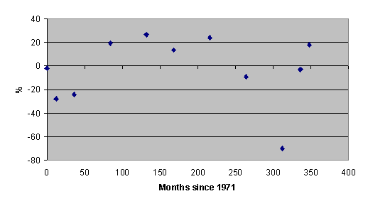 Figure 2: Percentage difference in expected number of transistors in Intel microprocessors.