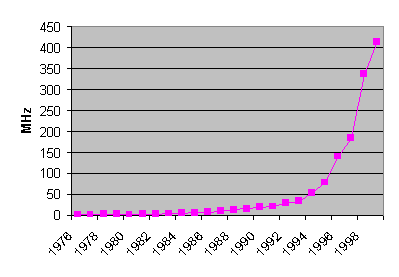 Figure 4 has several interesting characteristics. First, it should be noted that the data do not directly represent advances in microprocessor technology. It is based on computers that have been marketed to end customers. In that sense it does reflect changes in the actually available processing power. As can be seen from the Figure, until the end of 1980s the increase in the reported processor speed was quite modest. During the first decade, processor speed grew about four-fold and between 1986-1995 somewhat less than 10-fold. In about 1994, the clock speed started to grow much more rapidly.
