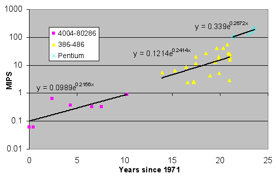 Fitting exponential trends to the data, it seems that MIPS ratings for Intel processors grew about ten-fold during the first ten years, in other words, doubling in somewhat more than three years. Due to the large variety of the 80386 and 80486 processors, exponential fit is not very good for the next ten-year period but the best fit has about the same rate of doubling. The small sample of data available for the Pentium processors indicates a somewhat faster rate of increase.