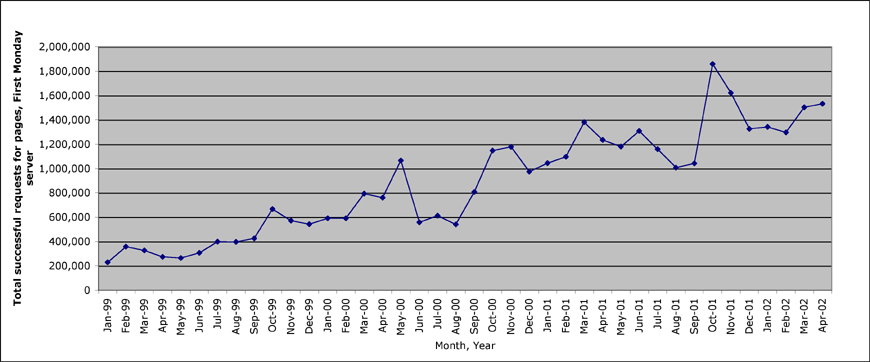 First Monday's growth has been remarkable since its move to the University of Illinois at Chicago. Thanks to innovations by the staff at the Library of the University and excellent Internet connectivity, First Monday has blossomed. Sharon's vision made this possible.