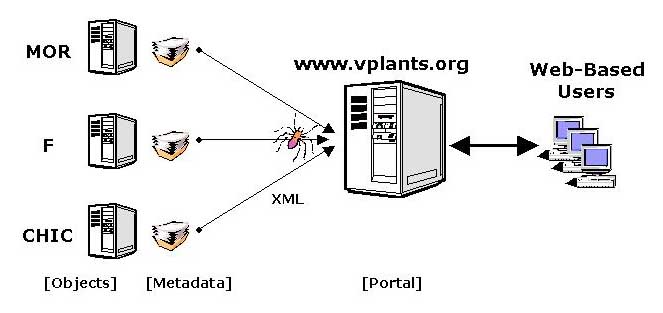 Figure 2: The Digital Collection - Technical ArchitectureEach vPlants partner will publish Metadata on the Web describing their Objects (herbarium specimens). On a regular basis, a Web agent (depicted here as a spider) will be dispatched from the portal to harvest the metadata, storing it in a searchable format on the Portal, http://www.vplants.org. A Web agent, which is also known as a "robot" or "web crawler," is a program that traverses a Web site, indexing the sites data in some useable format. This method of data collection is similar to the model followed by commercial search engines such as Yahoo!®, Webcrawler, and Alta-Vista. Web-Based Users will have a variety of searches and indexes available, giving them seamless access to the vPlants inter-institutional data set.