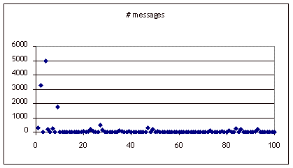 The total number of messages in the forums assigned for discussion of these products is shown in Figure 1. The vast majority of them led to very few messages over the lifetime of the product. In fact, 33 out of 100 projects had 0 messages! At the same time, a few products led to great discussion with the highest number of messages over a lifetime of a product standing at 4,952.
