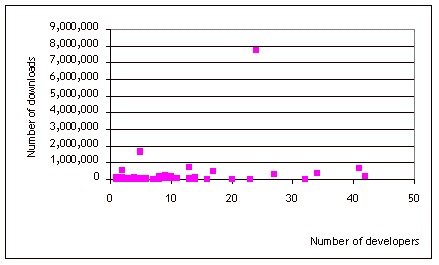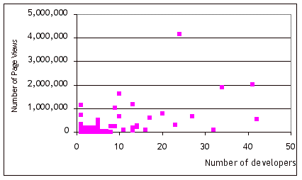 Finding 3: Products with more developers tend to be viewed and downloaded more often.Figures 2 and 3 clearly show the trends. The page views and downloads are over the lifetime of the project. The actual correlation between the number of developers and page views is 0.56 and that between the number of developers and downloads is 0.27.