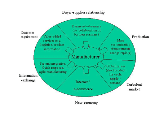 Networked B2B-EC applications, especially on the Internet and through inter-organizational information systems, have resulted in many changes in the way B2B transactions can be carried out. Benefits from such approaches include rapid data exchange, low inventories and quick response time. All these require a high degree of interaction and some degree of system integration between supplier and customer (Archer and Yuan, 2000). A key challenge for B2B-EC is to overcome the difficulty in data interchange between supplier and customer. Traditional ways of B2B e-commerce, such as by EDI, seems beyond the resource capacity of many small and medium-sized manufacturers, but it is often a requirement for doing business with a large company. The innovative B2B-EC provides a means of achieving a desired degree of interconnectivity without a huge investment on time, money and sophisticated technology. The diagram below shows the environment that manufacturers are currently facing (see Figure 1).
