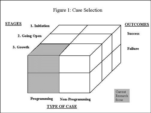 Open licensing projects can be classified by three dimensions: (1) programming or non-programming; (2) stage of development (initiation, going open, and growth/decline); and, (3) outcome at that stage (success or failure). These three dimensions help to define a case selection matrix with the dependent variable being success (project and product growth or stability) or failure (project decline or death) at each stage [ 11] ( Figure 1). Ultimately, our research project will study cases falling within each of the cells in Figure 1. Detailed case study is required to understand the factors that lead to successful and unsuccessful projects at various stages of the OS lifecycle. At the same time, we must sample enough cases that we will be able to say something definitive about what leads to the success or failure of these cases. This is especially important given that so much of the OS literature currently is based upon a small number of the successful "OS enterprise" cases like Linux (Eunice, 1998).