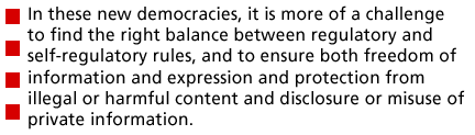 However, in these new democracies, it is more of a challenge to find the right balance between regulatory and self-regulatory rules, and to ensure both freedom of information and expression and protection from illegal or harmful content and disclosure or misuse of private information.