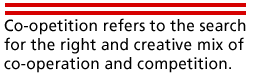 Co-opetition refers to the search for the right and creative mix of co-operation and competition, through, for example, the co-ordinated meeting of diverse possibly competing actors in a goal-focused and time-determined taskforce. This mix aims at creating mutually beneficial situations where providing diversity and generating synergies may help to create common goals and trajectories for all. This concept calls first for innovative institutional arrangements in public policy management, which includes the delegation of decision making and implementation capacity, as well as a citizen/entrepreneur-oriented mindset. Co-opetition frameworks have been used in areas such as infrastructure development for the benefit of the public, a safe digital environment, standards and interoperability, and also education, societal assessments, and democratic and environmental initiatives. Such arrangements also appear to be crucial in cluster development [ 16]. They based on the idea that reciprocal responsibilities pay better than "Winner takes all" games. They may nevertheless translate into privileged arrangements, which escape democratic control (nepotism) particularly because they seek consensus among a set of contradictory interests.