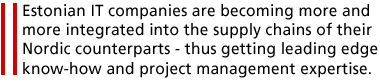 In order to benefit from that local expertise, many foreign companies have invested in software houses (e.g. in Estonia, Bulgaria and Hungary) or have outsourced their work, taking advantage of the high quality and low prices in computer software markets in the CEEC. Estonian IT companies, for example, are becoming more and more integrated into the supply chains of their Nordic counterparts thus getting leading edge know-how and project management expertise. Estonia, with its well-educated population and government emphasis on ICT development, is considered to be an 'excellent test market' for new technologies [ 26]. In Latvia, however, despite the availability of good specialists, insufficient government support and access to venture capital limit the competitiveness of IT companies. Other drawbacks are the lack of marketing skills in many companies and the mismatch between university training and practice [27].