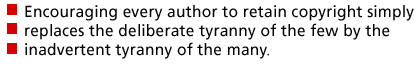 The argument sounds convincing at first. But think what happens in practice. A single publisher produces journals with thousands of articles by thousands of authors each year. If all authors retain the copyright, but give the publisher an exclusive license to publish for a period of time, who really benefits? After the exclusive period expires, anyone who wants to make the journals available to the public (for example, in a new format online) will have to contact all those thousands of authors to obtain permission. Some authors will decline; some will be hard to find; some will be missing. Who then controls the journals? Surely not the authors. Surely not the public. The publishers retain control of the journals, even if they do not control the individual articles themselves. As before, authors have been used. They have fallen into the trap the publishers laid down nearly 300 years ago.
