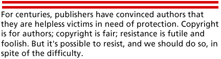 For centuries, publishers have convinced authors that they are helpless victims in need of protection. Copyright is for authors; copyright is fair; resistance is futile and foolish. But it’s possible to resist, and we should do so, in spite of the difficulty. The first step is to replace the 300-year-old publishers’ deception with some real understanding.