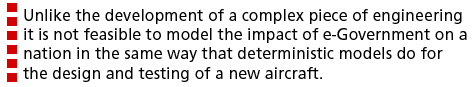 The implementation of an e-Government strategy is not a process of linear change, leading continually to the improvements expected by the theory. In highly complex societies the interaction of processes such as culture, geography, politics, economic attainment, coupled with the stresses of globalisation, can interact in unexpected and uncertain ways. Unlike the development of a complex piece of engineering it is not feasible to model the impact of e-Government on a nation in the same way that deterministic models do for the design and testing of a new aircraft. Yet it seems that few national strategies have built into them a process of monitoring and strategic change at the locality, rather than the national level. In general linear change is the expected norm, and few indications exist in the strategies that the policy makers have even addressed the impact of catastrophic change (such as the events of 11 September 2001).