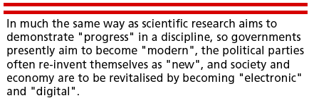 Information Societies, e-Societies and e-Government all are processes underpinned by digital information communications technologies (ICTs). The expectation of these processes is that they will lead to improvements in areas such as governance, democracy, efficiency, and economic competitiveness. The expectation of success does, of course run counter to the traditional oxymoron "Government Organisation" (Woods, 2002), particularly given the very uneven success of IT adoption by governments. Furthermore, economic, cultural, political and social change induced by technologies is not new to ICTs. So, we may ask to what extent the expected outcomes of e-Government are necessarily 'new' or 'modern'. Renaissance Europe saw significant changes in society, business and political practices following the introduction of the printing press (Eisenstein, 1983). One particular development was a new industry, the printing trade, which soon began to worry about the potential for intellectual property to be stolen in new ways, and there were concerns that information deemed illegal or dangerous by governments could be expressed and communicated easily so that "it was quite natural that attempts to control the press were made soon after the invention of printing" [ 1].