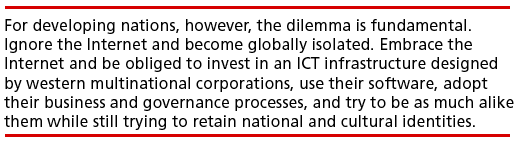 Even as they connected to the Internet, developing countries may find themselves still in a disadvantaged position. President Clinton, in his 1998 State of the Union Address, focused on the "next generation Internet". While Clinton's goal was to link everyone in the world, Kling questioned "but will the real beneficiaries be ordinary people, rather than wealthy organisations?" [ 30] stressing also the need to build the social skills to use new technologies. For developing nations, however, the dilemma is fundamental. Ignore the Internet and become globally isolated. Embrace the Internet and be obliged to invest in an ICT infrastructure designed by western multinational corporations, use their software, adopt their business and governance processes, and try to be as much alike them while still trying to retain national and cultural identities.