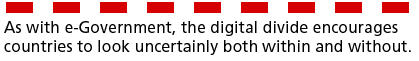 "The biggest inhibitor of e-governance was felt to be the cost of computers and other equipment, but this was closely followed by Internet cost issues, slow Internet connections, lack of digitised government information, ownership and monopoly of telecommunication services, availability of training for Government officials and the lack of political awareness of the opportunities." (UNESCO, 2002)These statements identify one of many ICT contradictions, because the strong internal controls that ICTs can bring a government (integrated information, joined-up policy making and monitoring, comprehensive communications) seem then to be mitigated as the ICT infrastructure is linked globally. A further concern over homogenisation of policy warns "there is a risk that one-dimensional definitions of social progress, stressing economic efficiency, will spread worldwide and level traditional cultures" [ 27].