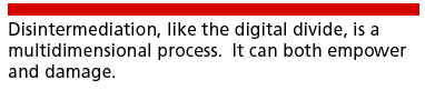 "... giving ICT access to poor people will make them information rich; that there is more to inequalities of information than a north/south context; that giving people access to information directly improves their quality of life; that creating an information society directly improves democracy and participation; and, given enough information we can solve all the world’s problems." [ 45](e) Inclusion exclusion, abilities and digital divides