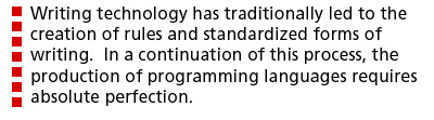 Marshall McLuhan notes that nobody ever made a grammatical error in a non-literate society [ 2]. Writing technology has traditionally led to the creation of rules and standardized forms of writing. In a continuation of this process, the production of programming languages requires absolute perfection. Language rules were once reinforced as literacy spread; the printing press introduced the quest for correct spelling, grammar, and pronunciation. Today, any error in the syntax of programming languages, comparable to a typographical or a grammatical error in natural languages, represents not a mere flaw in the text but is likely to result in failure and uselessness of parts, if not the text as a whole. The success of a computer program depends on the absolute conformity from their authors as the difference between an upper and a lower case letter can cause a program to fail to execute.