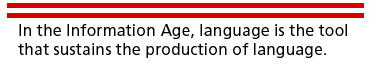 Until quite recently, the tools we used for the production of language were physical objects, such as clay tablets, papyrus, the pen and the brush, the printing press, and typewriters; today, contrariwise, we apply software in the process of writing. Technology and language have long been interconnected. However, what has immanently changed is that today technology is language. Software, as all media-based information in the Information Age, essentially consists of language. Behind the interface that appears on the desktop when opening software such as Microsoft Word or Word Perfect is a series of written instructions and commands that enable the user to apply it in the production of language. Or, put differently, in the Information Age, language is the tool that sustains the production of language.