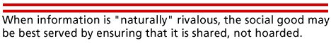 "are not a consequence of scarcity. They are the deliberate creation of statute law; and, whereas in general the institution of private property makes for the preservation of scarce goods, tending (as we might somewhat loosely say) to lead us "to make the most of them," property rights in patents and copyright make possible the creation of scarcity of the products appropriated which could not otherwise be maintained. Whereas we might expect the public action concerning private property would normally be directed at the prevention of the raising of prices, in these cases the object of the legislation is to confer the power of raising prices by enabling the creation of scarcity" [ 14].This protection of rights for the express purpose of raising prices is, of course, the central issue that we will return to below.