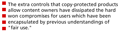 "rescind traditional "fair use" rights to browse, share or make private copies of copyrighted works in digital formats, since works may not be accessible without payment, even for legitimate uses. For developing countries, where Internet connectivity is limited and subscriptions to online resources unaffordable, it may exclude access to these materials altogether and impose a heavy burden that will delay the participation of those countries in the global knowledge-based society" [ 35].The extra controls that subscription online services, and copy-protected products allow content owners have dissipated the hard won compromises for users which have been encapsulated by previous understandings of "fair use."