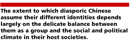 Today, overseas Chinese communities are found in literally most countries of the world, ranging from Calcutta to the West Indies, and they have made significant economic, social and political impact in many of these places. Inevitably, the issue of their identities and loyalties arise as nation-states viewed them with great suspicion; they feared this primal urge of recalling and being pressed into the service of a powerful, threatening China. At its core, this view privileges a fixed, singular identity frozen in the mists of time and that diasporic Chinese are in effect "sleepers" to be activated by some remote, cryptic and mythical code. But as numerous writers have argued, identities are constantly struggled over, changing, proclaimed and mobilised. The outcome is not predetermined but reflects a political contest over the exercise of power and meanings. Indeed, various studies have point out that diasporic Chinese communities have followed distinct paths of development and acquired identities that are different from each other.