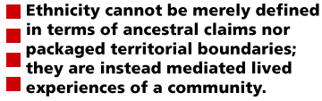 Too often, critics of identities equate the (re)discovery of "ethnic" identities by diasporic communities as reactive and symptomatic of the primordial calling of the nation. In one sense, that is true as nation-states traditionally confers upon its subjects identities but it may also be the font of "ethereal wisdom" and enjoyable [ 10]. They fulfil our emotional functions allowing us to "escape from triviality" [ 11], and also provide us with "a pervasive system of social classification", an organising "principle of vision and division" of the social world, a standardised scheme of social accounting, an interpretative grid for public discussion, a set of boundary-markers, a legitimate form for public and private identities, and "a ready-made template for claims to sovereignty" [ 12]. These relations, as various critics point out, foster the concept of an imagined homeland and can engender volatility, violence, exclusivity and a retreat into fundamentalism (Hobsbawm, 1990; Ignatieff, 1994), pre-empting the possibility of any meaningful "cross-cultural" dialogue or social intercourse.