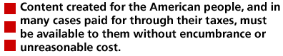 We must also get a lot better at recognizing, obtaining and managing the intellectual property rights of our content. Content created for the American people, and in many cases paid for through their taxes, must be available to them without encumbrance or unreasonable cost.