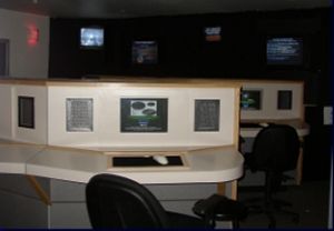 Figure 2: The LOPARC control room is located near the exhibit hall in Lowell's Steele Visitor Center, about 125 feet from the telescope dome. In this photograph, informational displays and a video feed from the telescope are visible at the front of the room, while the six clients are housed in consoles and are controlled via a point-and-click interface.