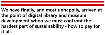 The early years of digitization in libraries and museums called upon experts from many domains within single institutions, as well as across institutions, to think deeply about how to build online collections worthy of dissemination and continued access. This thinking has been accompanied by equally careful thought, if considerably more anxiety, about how to preserve those collections, bit by bit and object by object. We have finally, and most unhappily, arrived at the point of digital library and museum development when we must confront the hardest part of sustainability how to pay for it all.