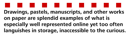 That said, it is not possible at this juncture to know what kinds of content and services will have value over time. We have little understanding of the online environment at present and no understanding of how it and its users might evolve over time. Hence the need for projects that take calculated risks and try something new. But it is still legitimate to question the wisdom of some collecting institutions that rush to put up collections that have worked well in a physical environment without consciously re-examining assumptions about exhibit and access. It is also legitimate to question the value of putting up collections that that have been wildly underused in the physical environment ("Oh, if only this were online, people would use it ... ."), unless the reasons for lack of use relate directly to the physical fragility of the source. Drawings, pastels, manuscripts, and other works on paper are splendid examples of what is especially well represented online yet too often languishes in storage, inaccessible to the curious.