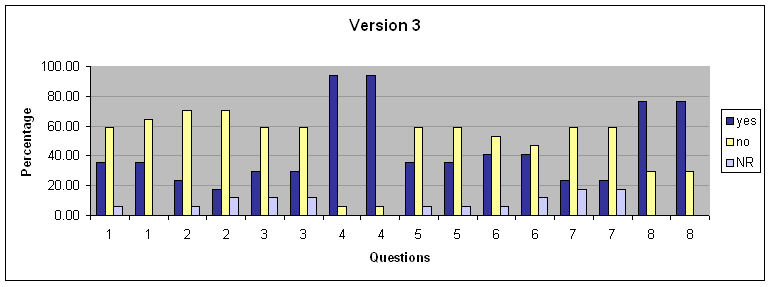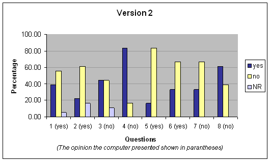 In Version 2, where participants were given the computer’s opinion before they answered the opinion question, results indicate that the responses were varied and that they did not follow a pattern. In other words, there was no significant correlation between the computer’s and the participants’ responses. There were not any strong preferences except for a high "yes" for Question 4, which did not match the computer’s opinion (see Figure 2).