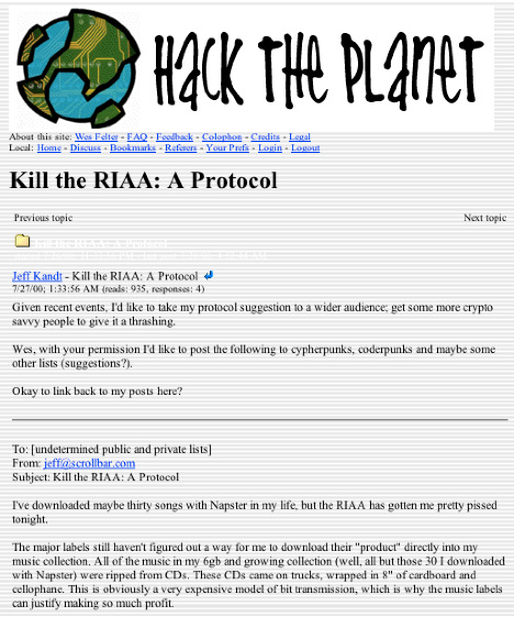 A contemporaneous hacker site is even more violent in its rhetoric, headlining itself "Kill the RIAA." The site promotes a code-based protocol for direct artist-to-fan distribution. While welling up from within hacker culture, this proposal is fairly benign. It involves extension of code for MP3 files to facilitate listeners making direct contributions to the music’s creators, thereby cutting the RIAA and similar copyright holders out of the exchange, and eventually "killing" them.
