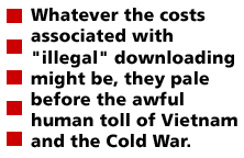 While participants in the peer-to-peer debate from all sides of the issue routinely pursue analogies drawn from across centuries of military history, the most common comparisons remain those which repurpose the language and history of the Cold War (and of Vietnam, the paradigmatic "little war" within the bloated corpus of the Cold War). These comparisons grossly inflate the stakes of the debate. As Zikzak’s eruption rightly reminds us, there is no body count associated with peer-to-peer file transmission. Whatever the costs associated with "illegal" downloading might be, they pale before the awful human toll of Vietnam and the Cold War. Why then does the analogy prove irresistible to participants in this debate? The answer is, in part, that there are a number of superficial similarities between the history of the Cold War and the history of the peer-to-peer debates.