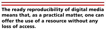 I have scrupulously avoided references to "file sharing" to this point, because the term functions as a troubling counterweight to the hyperbolic characterizations of peer-to-peer rising from the content industries. The rhetorical positioning of peer-to-peer exchanges as "sharing" fails to acknowledge the special nature of digital media. Prior to the advent of digital media, sharing a particular resource typically implied at least momentary depletion of that resource. The person offering the resource would lose at least the use of the resource for the time that the resource was being shared. But the ready reproducibility of digital media means that, as a practical matter, one can offer the use of a resource without any loss of access. Lawrence Lessig casts this distinction as one between "rivalrous" and "non-rivalrous" resources, and observes: