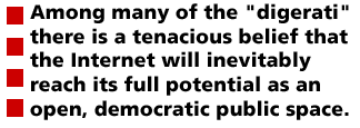 At the same time, we have to consider what will likely happen if a public interest initiative to create the ASN does not take place. Among many of the "digerati" there is a tenacious belief that the Internet will inevitably reach its full potential as an open, democratic public space. Even the dot com crash has done little to challenge the assumption that as the technology keeps evolving, the public interest will somehow be served (as long as governments are willing to police privacy abuses). This attitude ignores the fact that, at key crossroads, choices between competing technical implementations must be made, and that different choices will favor different constituencies. Though public interest and commercial interests have often been aligned during the build out of the Internet infrastructure, this will not always be the case. In fact, divisions between the public good and the business agenda are now multiplying.